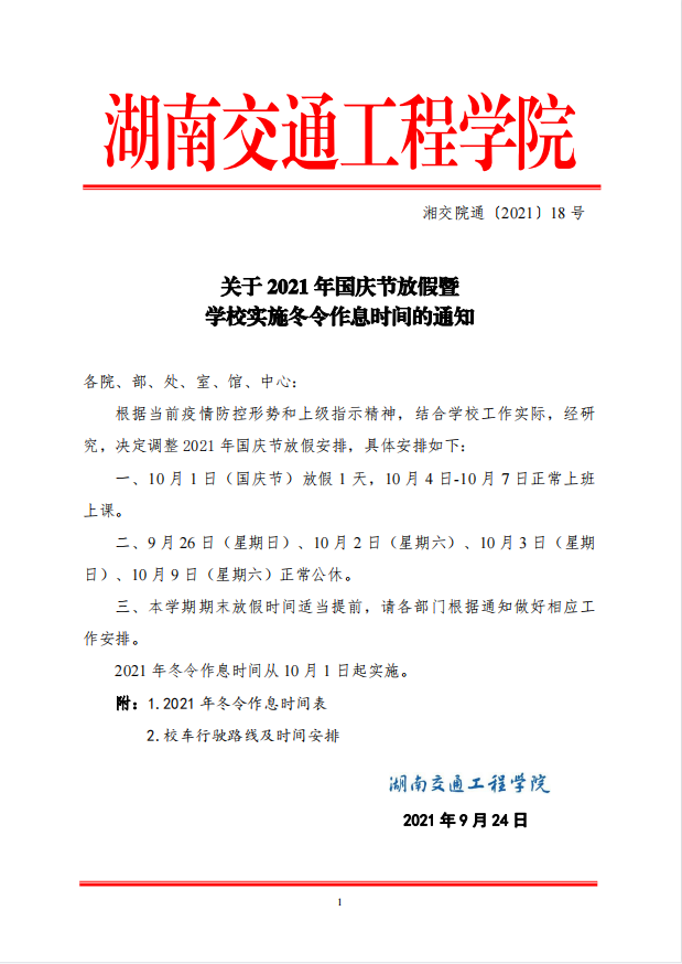 关于2021年国庆节放假暨学校实施冬令作息时间的通知