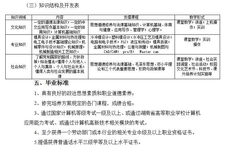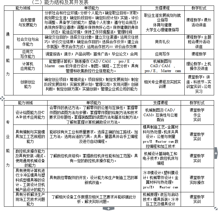 本专业培养德、智、体全面发展,掌握模具设计与制造专业必备的基础理论知识和专门知识,掌握模具设计及制造技术,具有较强实际操作能力的高等技术应用型专门人才。具有制订模具成型工艺的能力;具有模具设计的能力;具有模具制造的实际操作技能;具有对模具及成型设备的调试、维护及故障分析能力;具有模具新工艺、新技术和新设备的接受及应用能力;熟练掌握模具CAD/CAM技术。