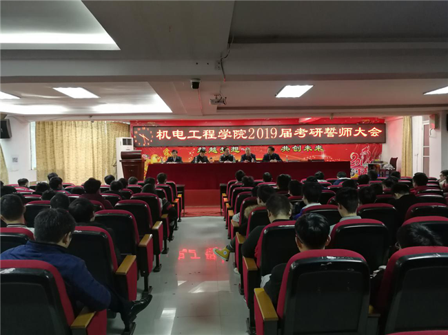 进一步推进考研工作,鼓舞考研士气,126上午,机电工程学院在体育馆大会议室举行2019届考研誓师大会。刘孟祥、黄名文副校长、冯小康院长、何美生书记、杨启正副院长、漆在林副书记等领导,机电工程学院全体辅导员及百余名考研学子参加了大会大会由机电工程学院何美生书记主持。大会首先由考研代表们发言,做考研冲刺总结。然后,刘孟祥副校长、冯小康院长、杨启正副院长都陆续发言,希望同学们能够结合自身实际情况,报考理想院校,成就实现自身价值,为新时代国家社会主义建设作出更大贡献。行百里者半九十,考研是一个学生提升自我、挑战自我的过程。本次誓师大会坚定了同学们的考研信心与决心,大家纷纷表示在考研过程中必将全力以赴、持之以恒,以优异的成绩回报母校地培养。