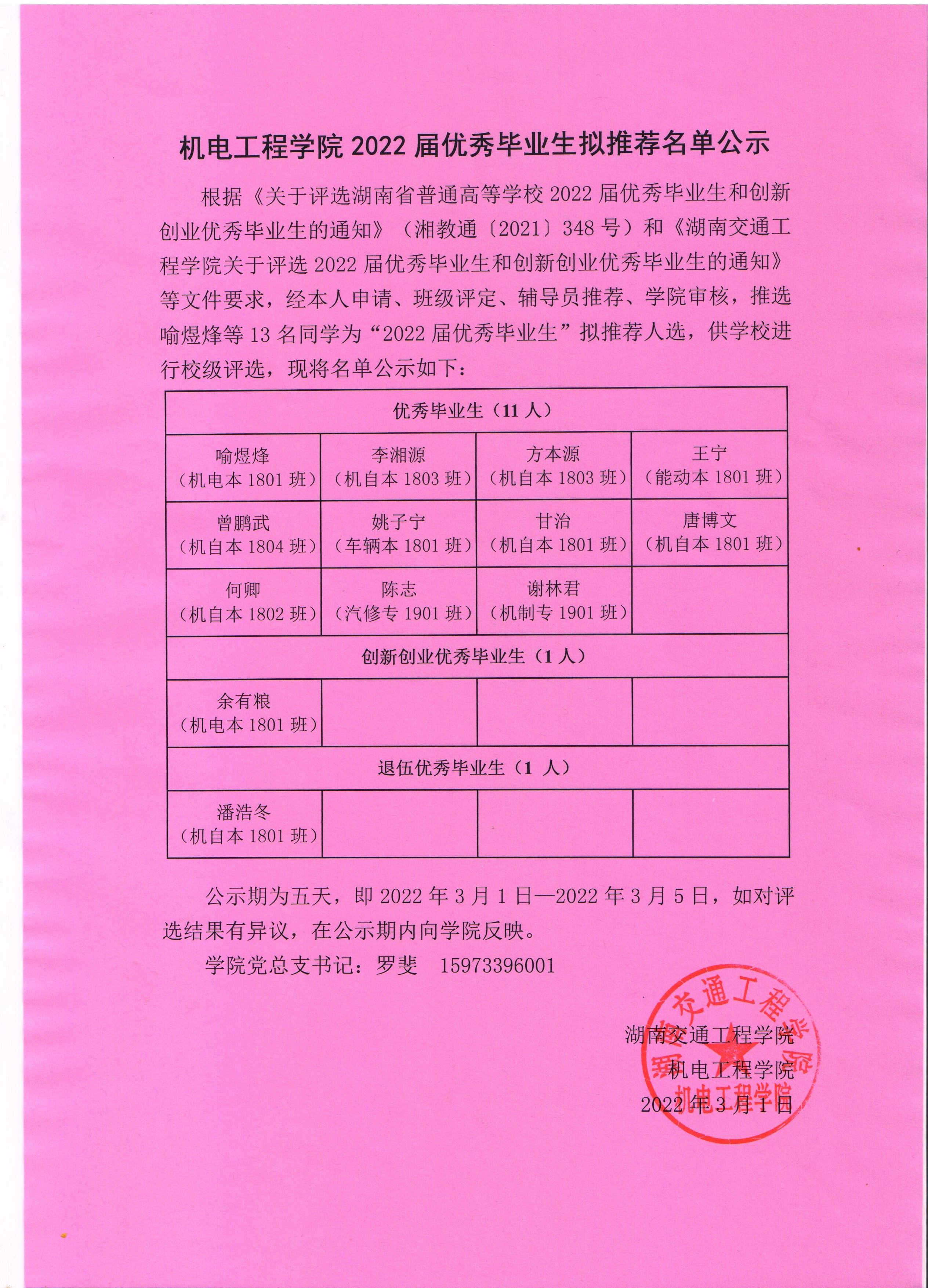 根据《关于评选湖南省普通高等学校2022届优秀毕业生和创新创业优秀毕业生的通知》(湘教通〔2021〕348号)和《新葡萄8883官网AMG官网关于评选2022届优秀毕业生和创新创业优秀毕业生的通知》等文件要求,经本人申请、班级评定、辅导员推荐、学院审核,推选喻煜烽等13名同学为“2022届优秀毕业生”拟推荐人选,供学校进行校级评选,现将名单公示如下:
