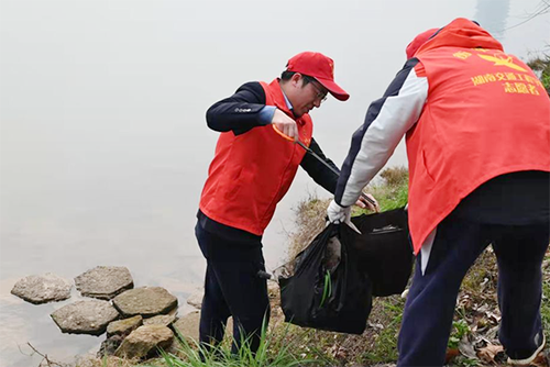“那个边上危险,让我来,你们小心些。”该校团委书记漆在林率先垂范,爬过围栏,攀附在河堤边捡拾垃圾。志愿者们忙得热火朝天,两人一组,一人手持垃圾钳捡垃圾,一人提着垃圾袋,经过两个多小时的努力,数十个垃圾袋装得满满的,湘江河岸焕然一新。活动结束后,漆在林说:“感谢同学们能积极参加保护母亲河志愿活动。雷锋家乡学雷锋,大家都是当代的活雷锋,同学们都很棒,希望同学们能将雷锋精神落实到自己的生活与学习当中,帮助他人,助人为乐。”