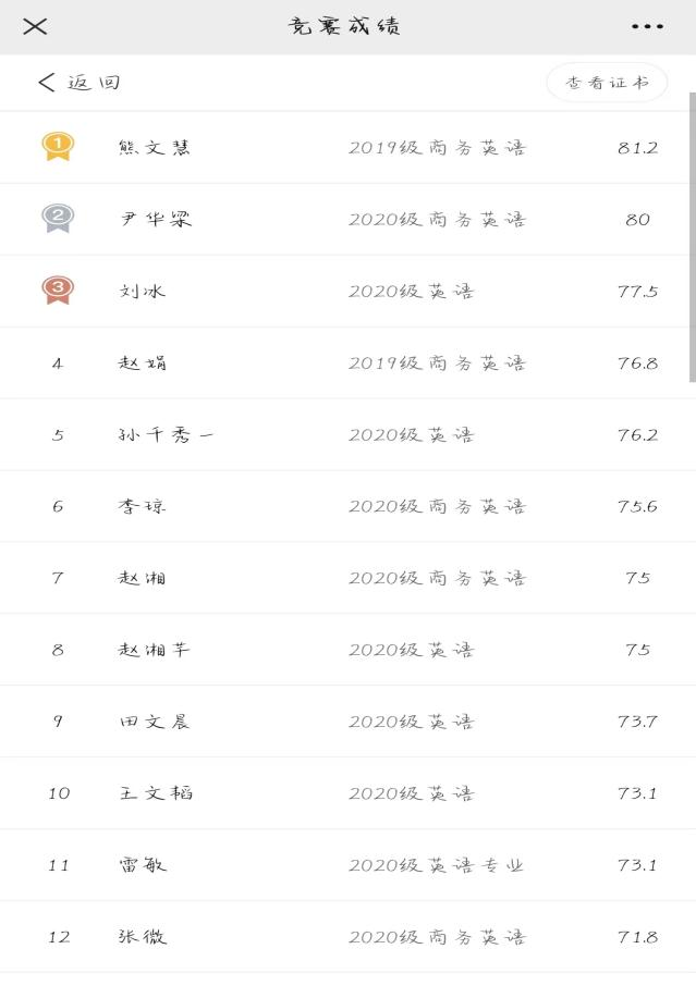 据悉,正式比赛前“词达人”公众号开通了考试加油包、免费思政词汇学习和一次赛前模拟考试,为各位考试提供了充足的备考资源。新葡萄考生积极备考,认真参考。据统计,新葡萄有来自英语、商务英语、软件工程、国际经贸等8个专业的435名考生参加,冠军得主为2019级商务英语熊文慧,分数为81.2分。这次比赛加强了对大家的思政教育,锻炼了同学们的应考能力。最后祝贺本届“外教社·词达人杯”校赛完美落幕。