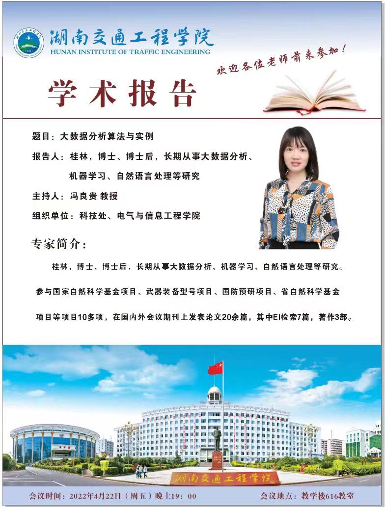 本网讯(学生记者 易石基 摄影 李琼)2022年4月22日,桂林博士受邀来访新葡萄电气与信息工程学院,并为众师生带来一场题为“大数据分析算法与实例”的学术报告。电气与信息工程学院大数据专业的学生参加了本次活动,报告会由科技处处长冯良贵主持。