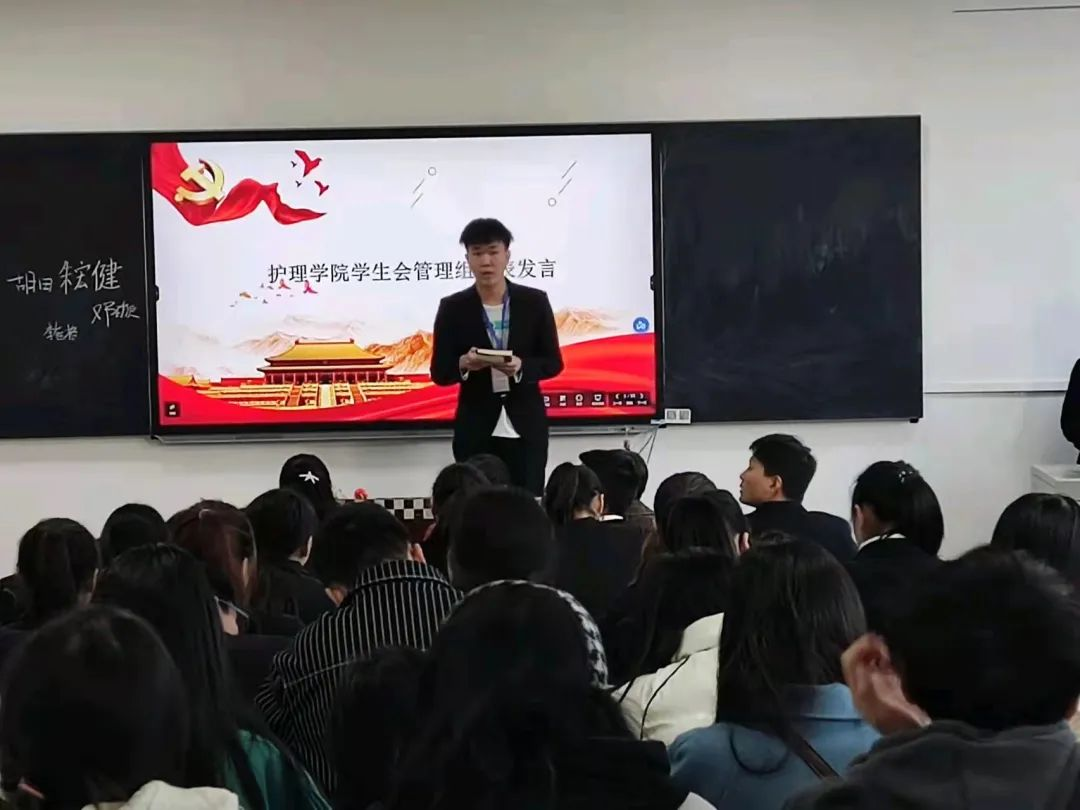 随后护理学院学生会主席团代表朱宏健、管理组代表、各部门新干、执行主席石晶进行发言,执行主席石晶就近期学生会存在的问题进行了指正。