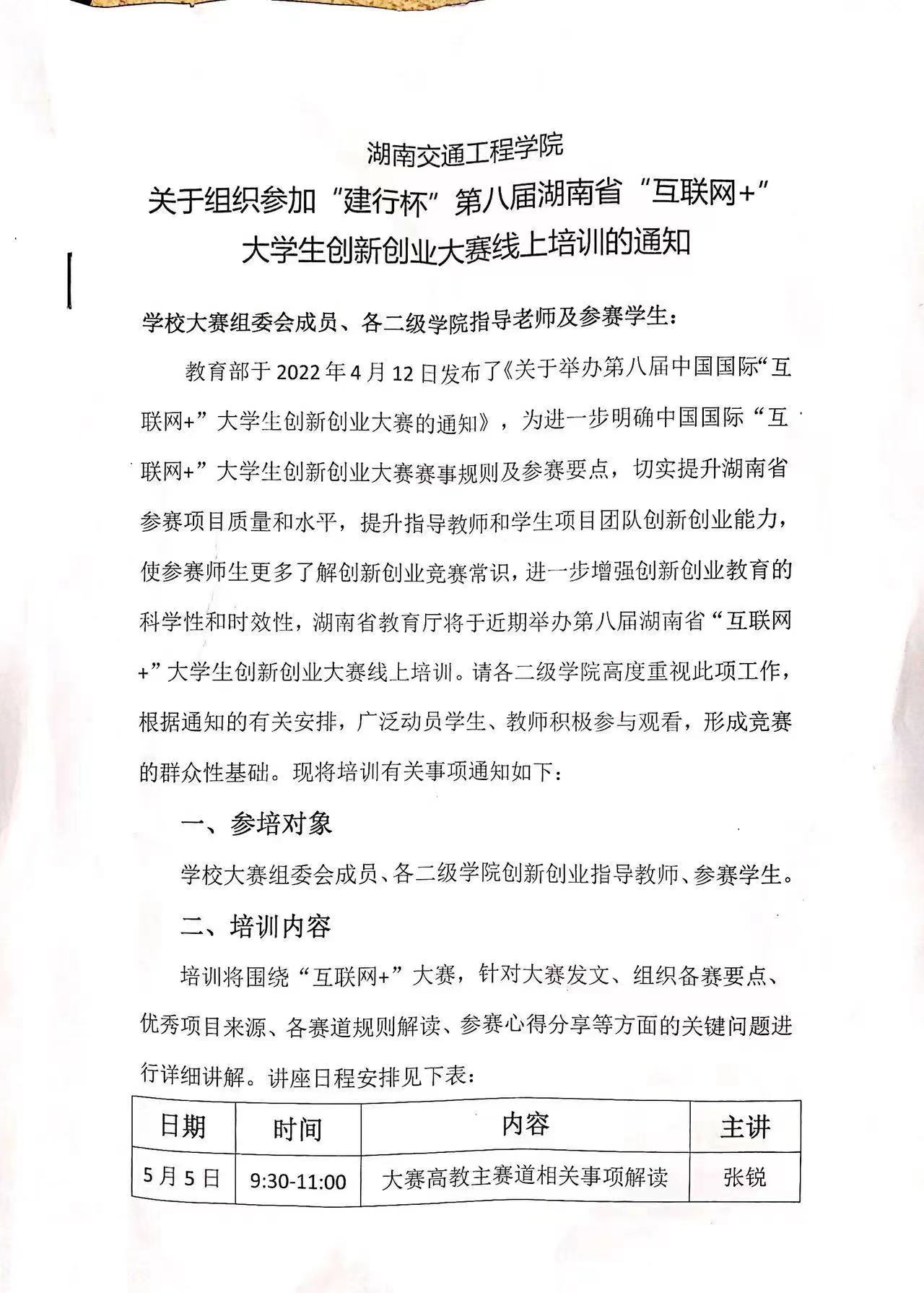 新葡萄8883官网AMG官网关于组织参加“建行杯”第八届湖南省“互联网+”大学生创新创业大赛线上培训的通知