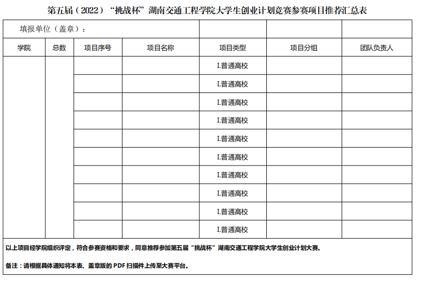 4、把握节点,及时报送。推荐校赛的作品以二级学院为单位,填写汇总表 (附件 2)统一报送,每份作品需提交项目申报表(附件 1)、项目介绍书、 项目路演 PPT 及其他证明材料。纸质档 1 份用档案袋标注封面报送到航母楼2006,电子版报送至:hnjtgcxytw@163.com。