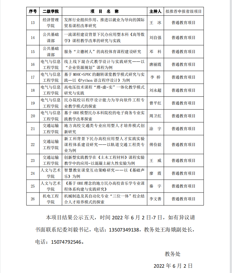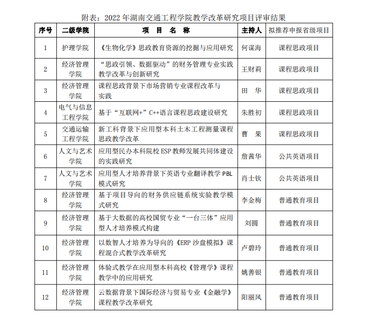 202261日,学校组织专家对2022年教学研究改革项目进行了集中评审,通过评审拟推荐护理学院 的“《生物化学》思政教育资源的挖掘与应用研究”等26个项目(课程思政项目5项、公共英语项目2项、普通教育项目19项)校级立项并拟申报省级教研教改项目。