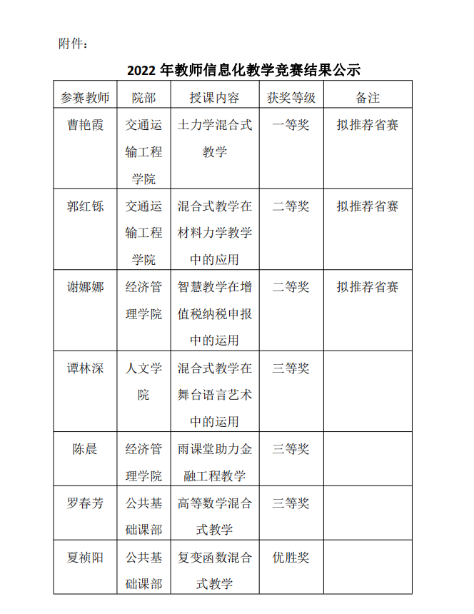 根据湖南省教育厅“关于开展2022年湖南省普通高校教师信息化教学竞赛的通知”的要求和“关于开展2022年新葡萄8883官网AMG官网教师信息化教学竞赛的通知”(湘交院教[2022]93号)的工作安排,经教师个人申报、各二级学院(部)初赛,于2022年8月24日学校组织决赛,经专家评审,曹艳霞等7位教师获奖(名单见附件),并拟推荐一等奖获得者曹艳霞和二等奖获得者郭红铄、谢娜娜三位教师代表学校参加2022年湖南省普通高校教师信息化教学竞赛。