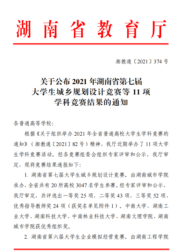 湘教通〔2021〕374号 关于公布2021年湖南省第七届大学生城乡规划设计竞赛等11项学科竞赛结果的通知