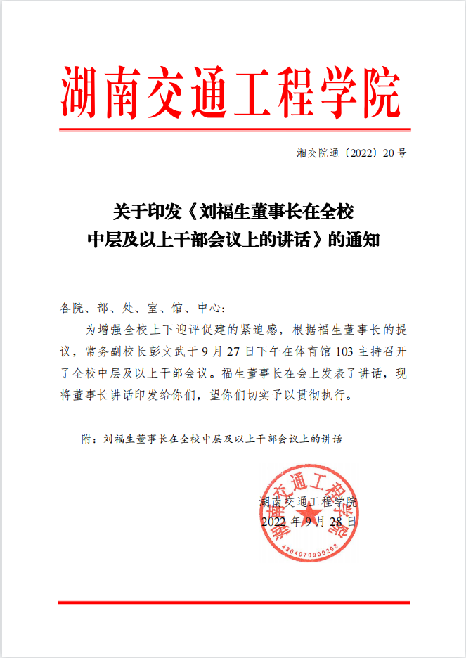 关于印发《刘福生董事长在全校中层及以上干部会议上的讲话》的通知